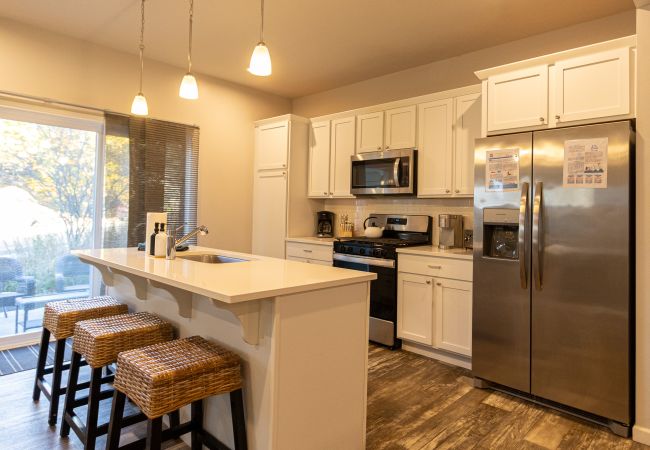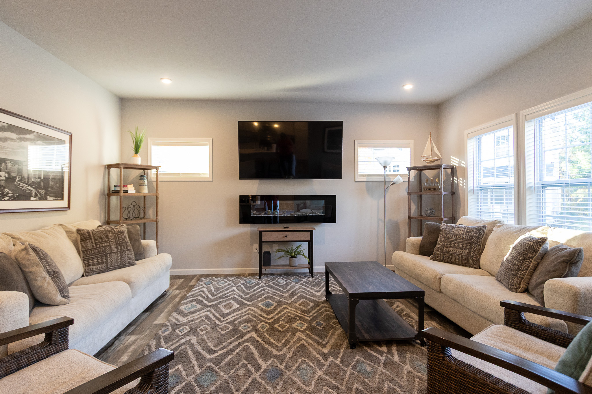 The main level of the home features a large open space where the living room, fully equipped kitchen, formal dining area, full bath and a queen guest bedroom! The main level has a walk out to the patio with plenty of space for the family to enjoy the summer days and nights. The patio is a short walk to one of the community firepits. The upper lever of the home has a large master King suite, a bunk room with a twin over top of a queen, a queen guest bedroom, and another full bath centrally located in the hallway next to a second living space with queen sofa sleeper. In the lower level (basement) there is an additional queen guestroom, full bath, and if you need to get away, a 3rd living room with a pull out sleeper couch. All 3 of the living rooms are furnished with plenty of seating and flat screen tvs so you can relax in style. The flexible layout of this home will sleep up to 14 guests comfortably.