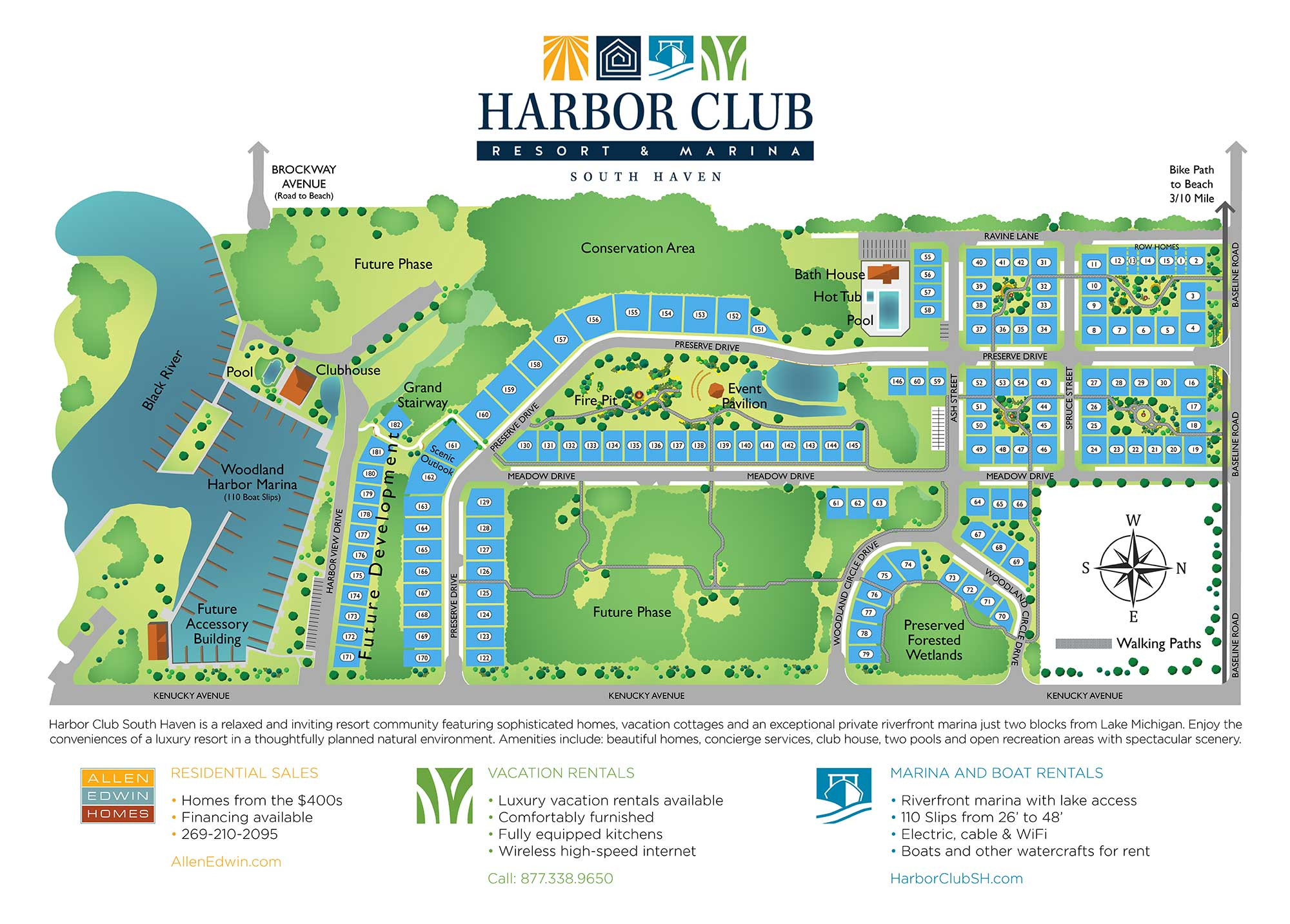 South Haven, Michigan is a quaint and peaceful beach-town that is perfect for families and groups looking to escape the hustle and bustle of the city. Our cottages are centrally located with access to the Kal-Haven Trail, beaches, the Black River, family activities, dining, shopping, golf courses, wineries, and more!This property is a vacation rental in the Summer (June, July, & August), available for long term rentals of 1-6 months outside of that season. Located 1 mile from downtown South Haven, 1/4 mile from Lake Michigan, easy commute to Holland, Benton Harbor, or Kalamazoo areas! The Harbor Club South Haven Resort offers private streets for walking or biking with pets, children, or the group you are traveling with. A quaint pond and bridge offer a peaceful place to stroll and watch the local wildlife. The Resort is located on preserved wetlands and woodlands on the Black River and includes a gorgeous private marina.