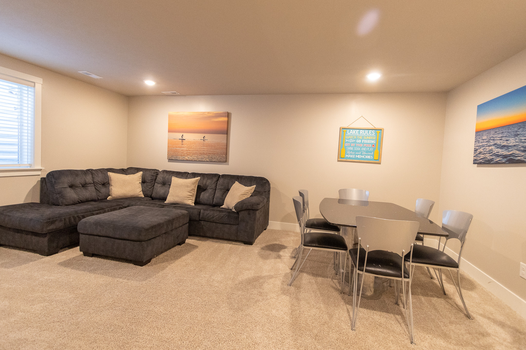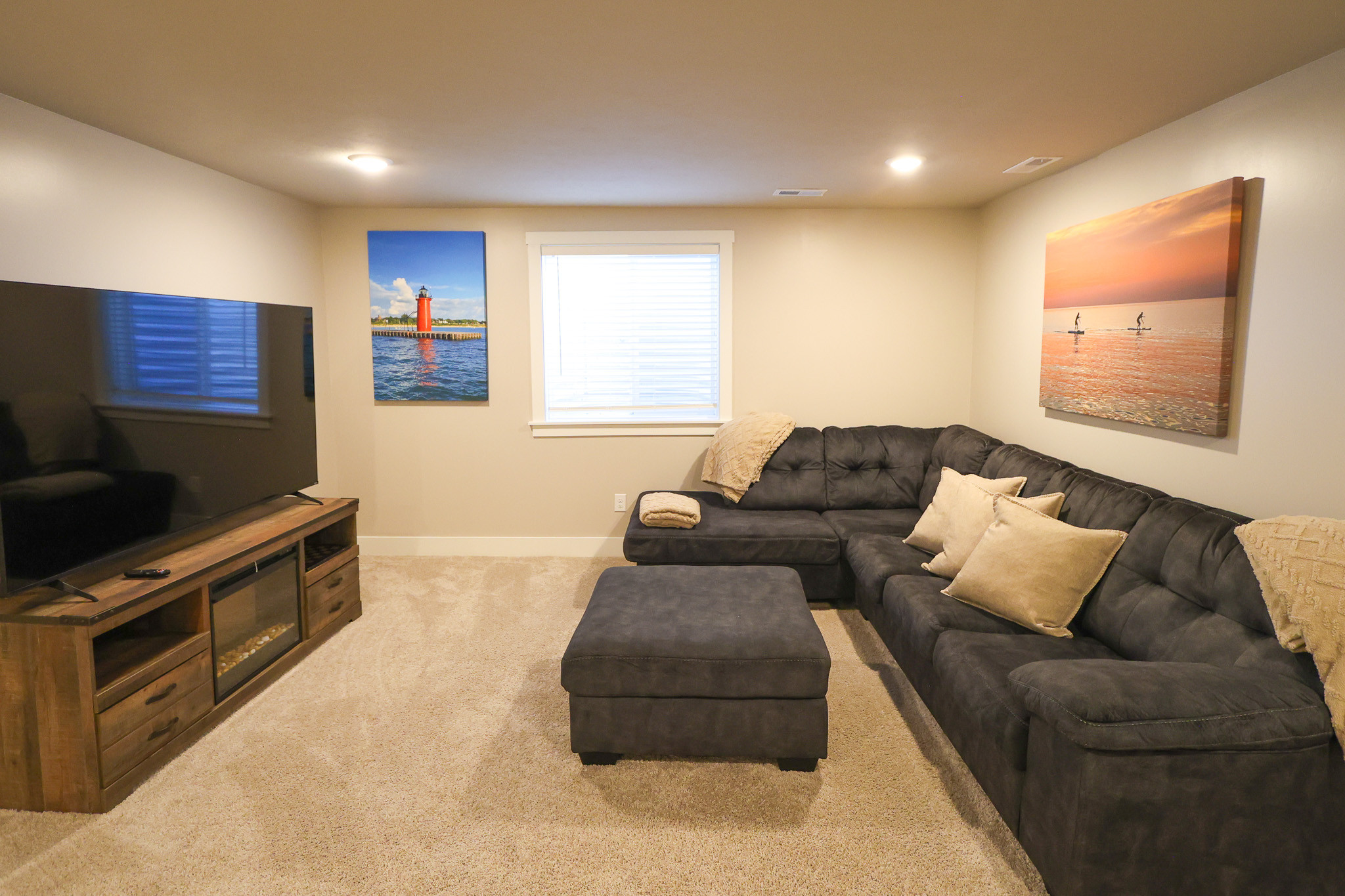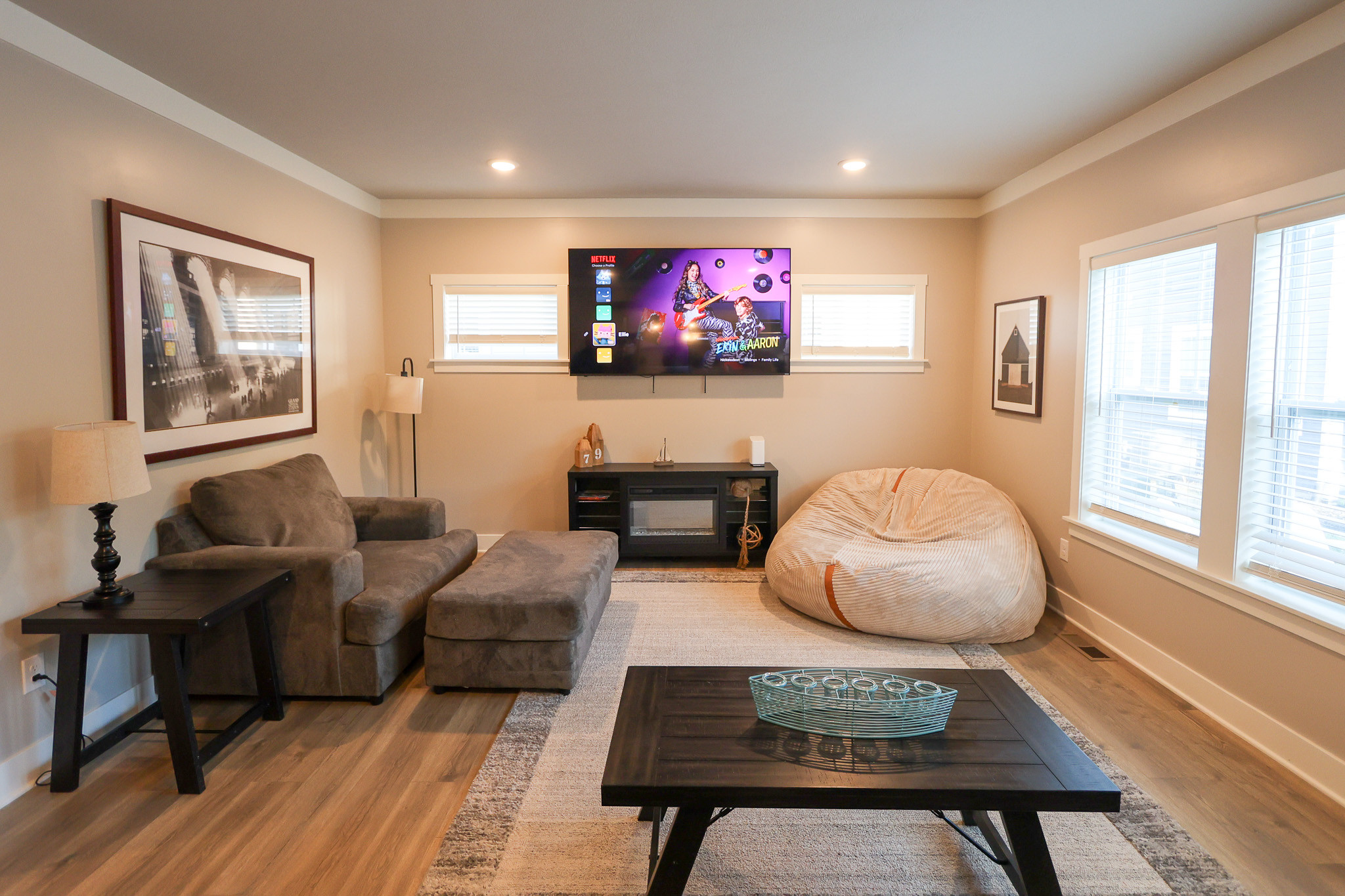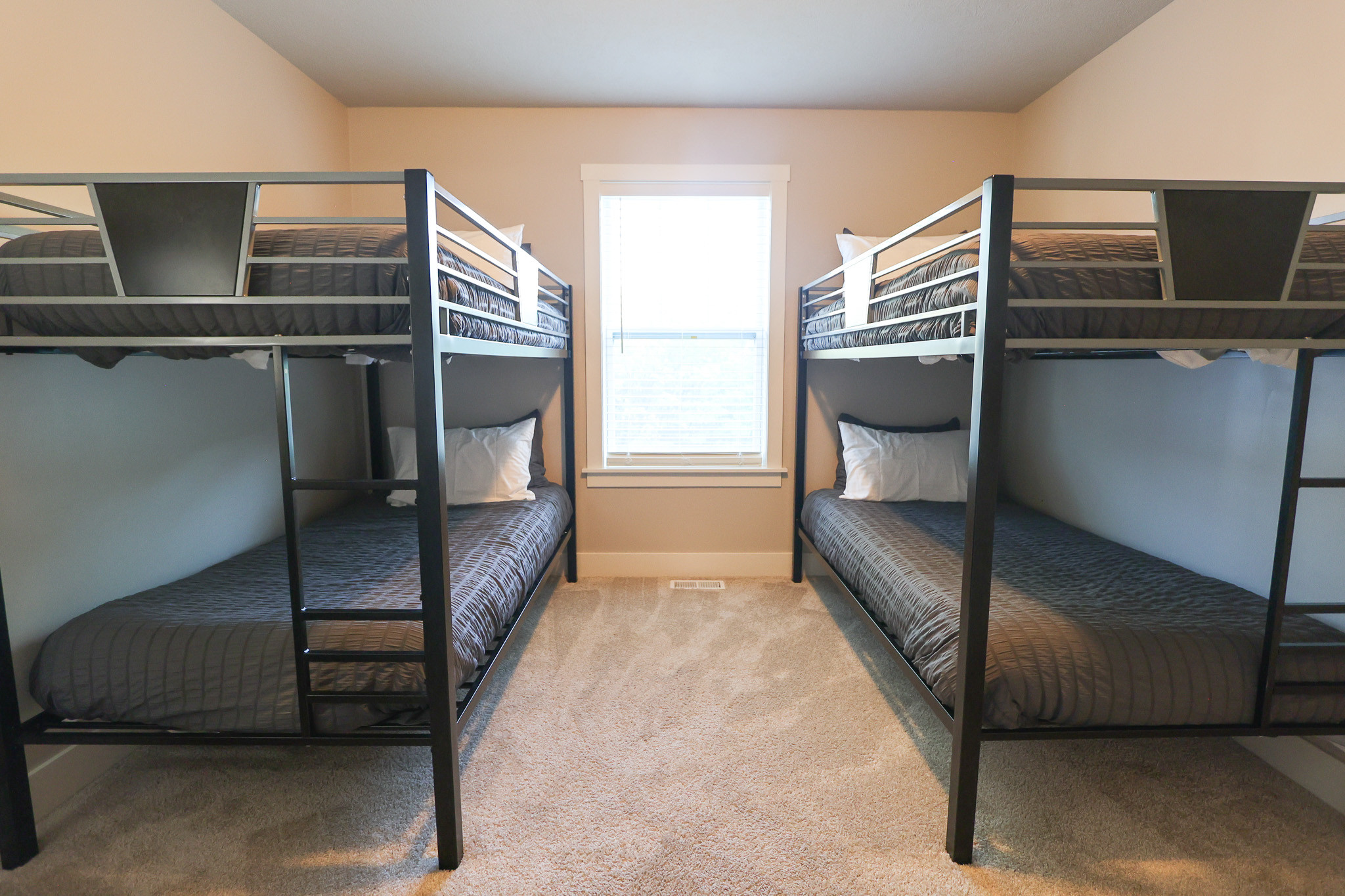 Northside Retreat boasts 4 Large Smart TV's (in both upstairs and downstairs common areas, Master Bedroom, and downstairs queen). All rooms have plush hybrid mattress and ample closet space.Enjoy privacy in the main level bedroom suite which features a king bed and full private bathroom. On the homes second level, everyone else sleeps comfortably! Here, you will find two queen bedrooms as well as a bunk guest room with 2 bunk beds (4 twins). The double sink vanity in the second floor guest bathroom offers ample storage space. An upper level master suite includes a full private bathroom with a large stand up shower and expansive walk-in closet. Hang out in the lower level basement area and play foosball, or watch TV on the huge bean bag and sofa! The flexible lay out of the home gives yet another bedroom and full bath on this level and allows the home to sleep up to 16 guests. If a second living room is required in the name of space, this home has that too. Choose the living room or grand room area, and enjoy one another's company in either of these gathering areas.
