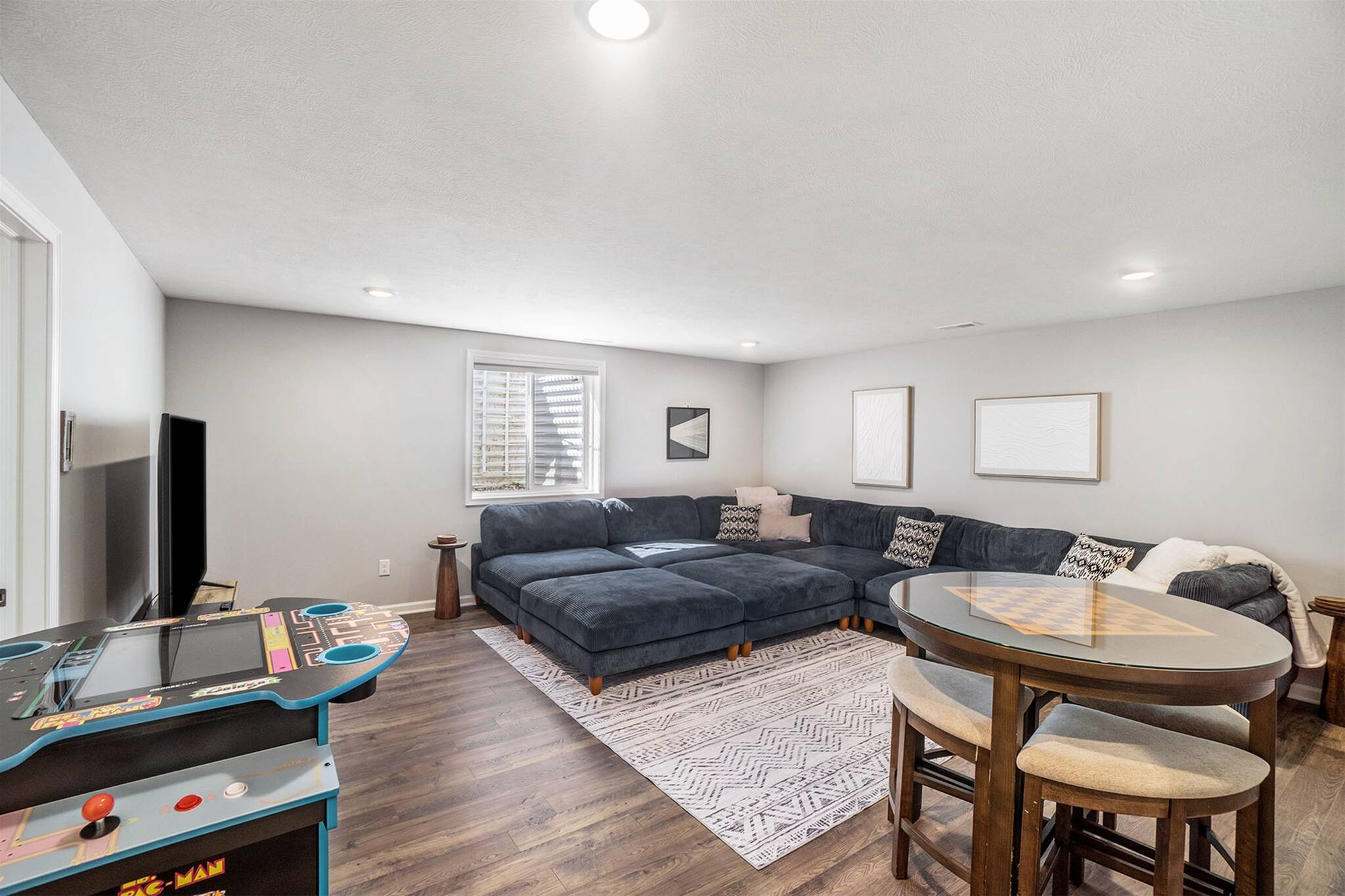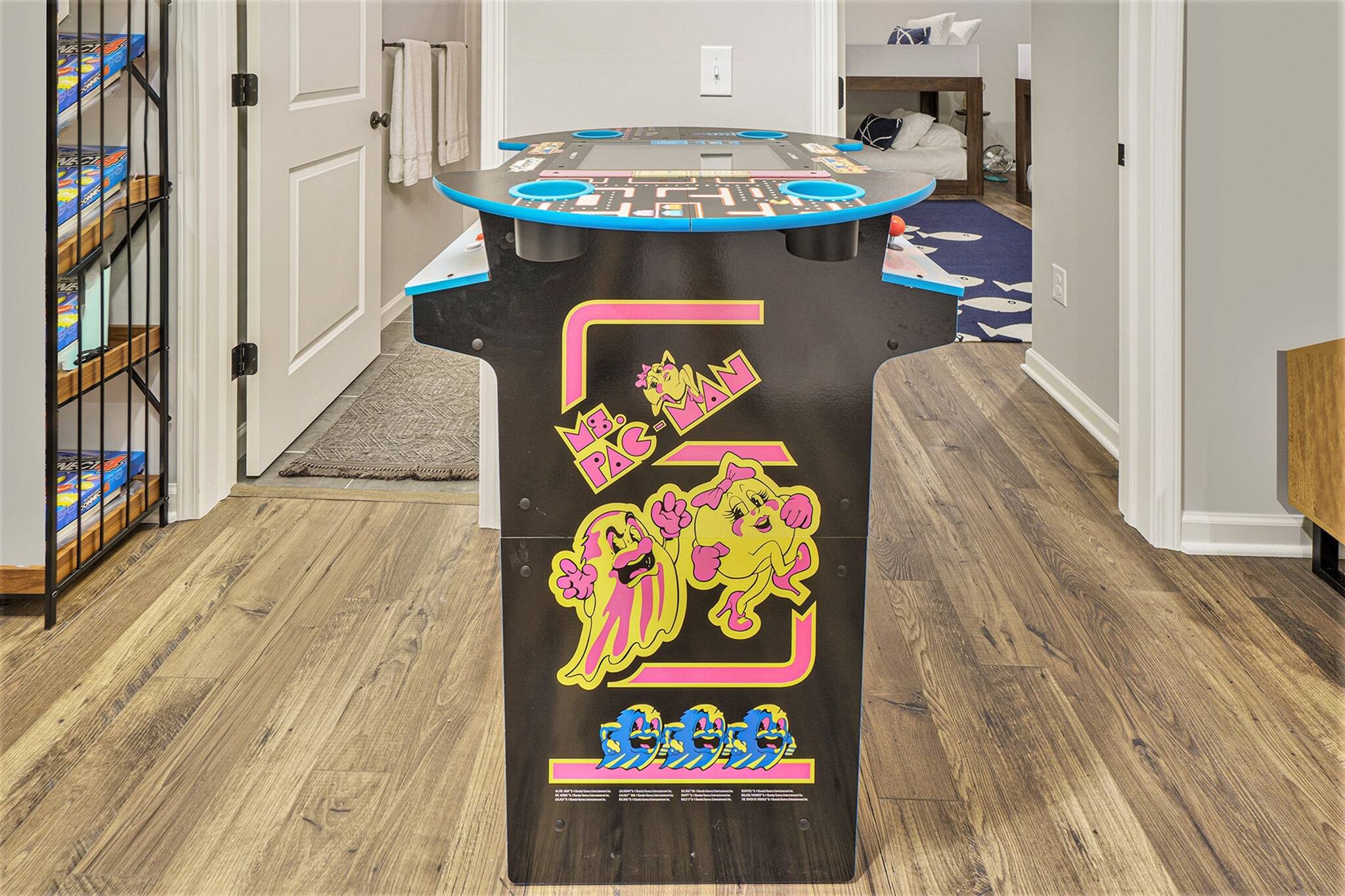The upper lever of the home has a large primary king suite, two queen guest bedrooms, a twin bunkbed guest room (4 twin beds each with a weight capacity of 400 lbs. making them ideal for adults and children), another centrally located full bath as well as a full laundry room. In the lower level (basement) there is an additional twin bunkbed guest room (4 twin beds each with 400 lb capacity), full bath, a large living room featuring a nearly 15 foot wide modular sectional couch, large smart TV, snack station, and vintage arcade games. The flexible layout of this home will comfortably sleep 14 guests with a proper bed for each person, making it an ideal home for multiple families, girls weekends, couples retreats, reunions, weddings and special events.