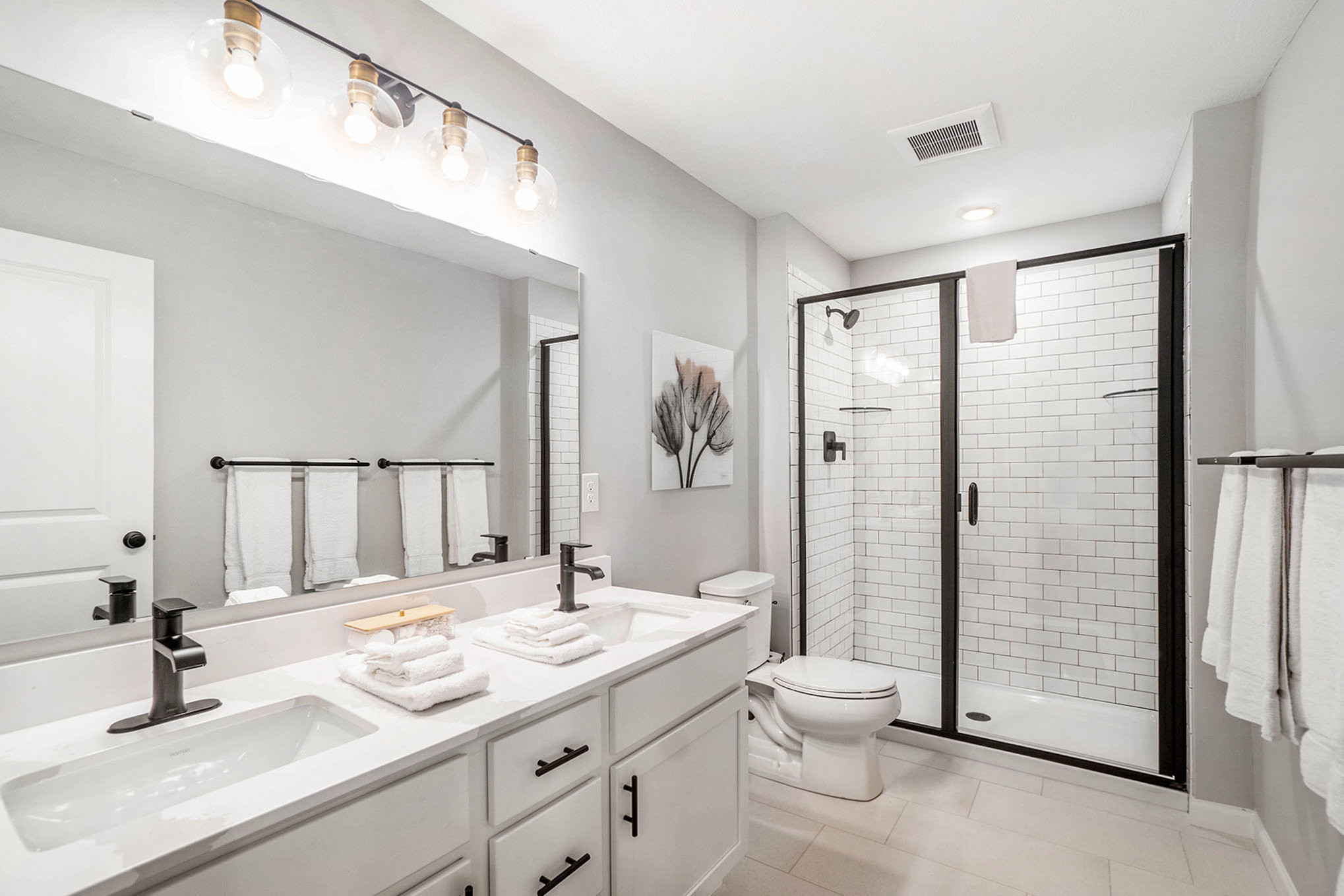 The upper level of the home has a spacious master suite with a plush king mattress awaiting your stay. Huge flat screen TV, seating for 2, full private bathroom, and walk in closet are also perks of this modern home's suite room. Two queen guest rooms, along with a double twin bunk room are sure to sleep up to eight more guests in luxurious comfort. Find a queen sofa sleeper in the lower level den - perfect for late night gatherings, or an additional sleeping space.