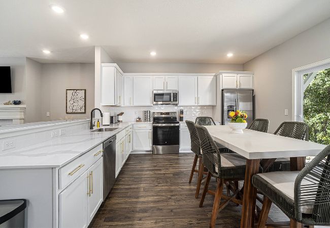 The main level of the home features a large open space where the living room, fully equipped kitchen, formal dining area, full bath and a queen guest bedroom! The main level has a walk out to the patio with plenty of space for the family to enjoy the summer days and nights. The patio is a short walk to one of the community firepits. The upper lever of the home has a large master King suite, a bunk room with a twin over top of a queen, a queen guest bedroom, and another full bath centrally located in the hallway next to a second living space with queen sofa sleeper. In the lower level (basement) there is an additional queen guestroom, full bath, and if you need to get away, a 3rd living room with a pull out sleeper couch. All 3 of the living rooms are furnished with plenty of seating and flat screen tvs so you can relax in style. The flexible layout of this home will sleep up to 14 guests comfortably.